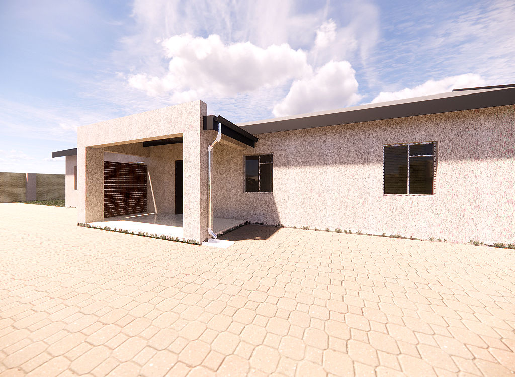 This rural home features a modern, minimalist design with a blend of flat and pitched roofs. The neutral-colored facade, complemented by black-framed windows, creates a clean, contemporary look. A wooden privacy screen near the entrance adds warmth, while the paved driveway and open courtyard enhance practicality in the rustic setting.